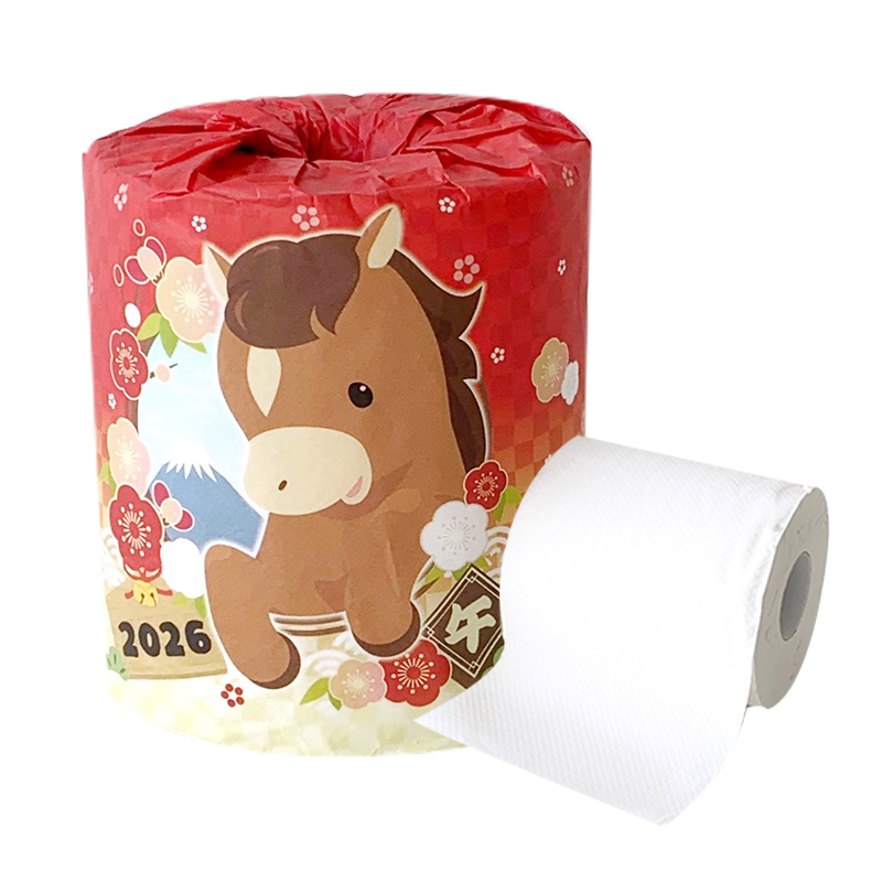 お正月限定デザインの紙巻個包装トイレットロール。干支の絵柄がデザインされた印象に残るご挨拶品。